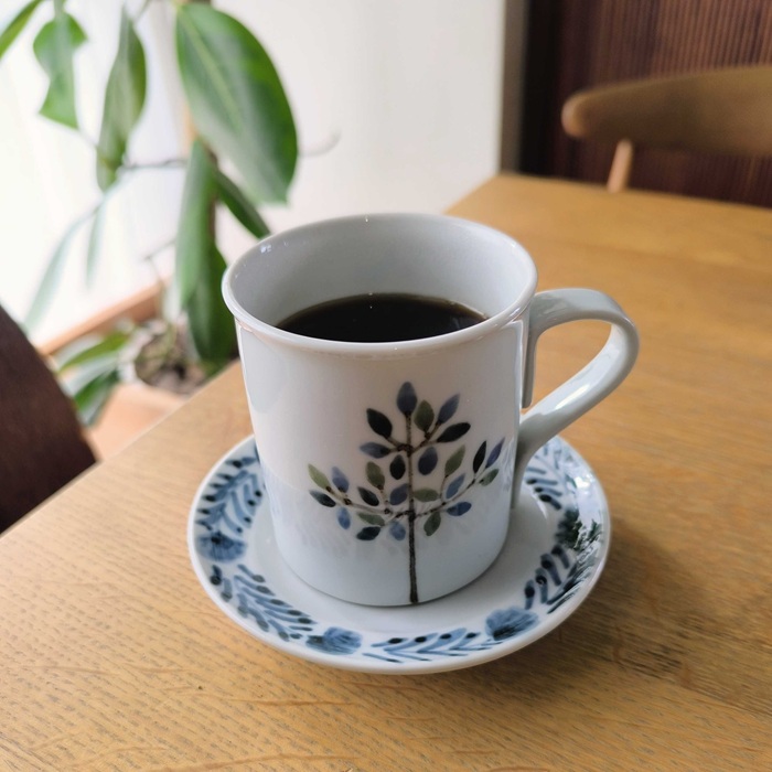 口元のそりがちょうどよく、唇に自然に沿ってとても飲みやすいです。大きすぎるマグカップは飲みきる前に冷めてしまいがちですが、こちらは大きすぎず小さすぎず、ちょうどよいサイズ感で日常使いにぴったりです。今回は別の作家さんのお皿をソーサーとして合わせてみましたが、同じ九谷焼ということもあり、統一感があり相性の良さを感じました。