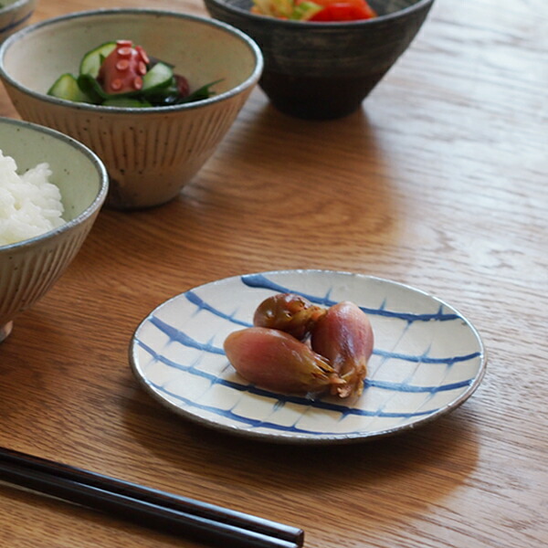 一般的なスリップウェアの大らかさとは異なり、涼しげで軽やかな印象です。高台はほとんどなく裏側は土の色を生かした仕上げになっています。丸皿4寸(約12センチ)は小皿としてどうぞ。ピクルスを盛り付けたり、しょうゆやマヨネーズなどのソース皿として使っても。また取り皿として何枚か揃えておくと重宝しそうです。