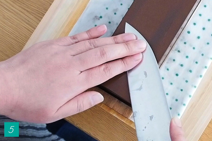 カエリは包丁と砥石が擦れ合って包丁の刃先がめくれあがってきた部分です。指の腹で触ったときに、ざらっと感じたらカエリがついている証拠です。包丁の刃の全体にカエリがつくまで研いでください。ザラつきを感じない部分は、もう一度研いでください。全体にカエリがついたら次の工程に進みます。