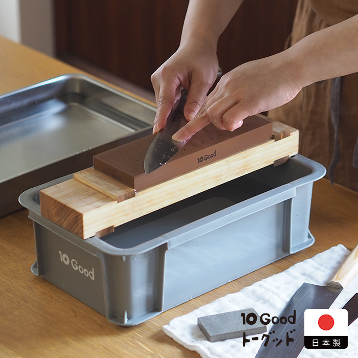 - 研ぎやすいように高さを出し、作業中に砥石が滑らないように固定させる台と濡れふきん
